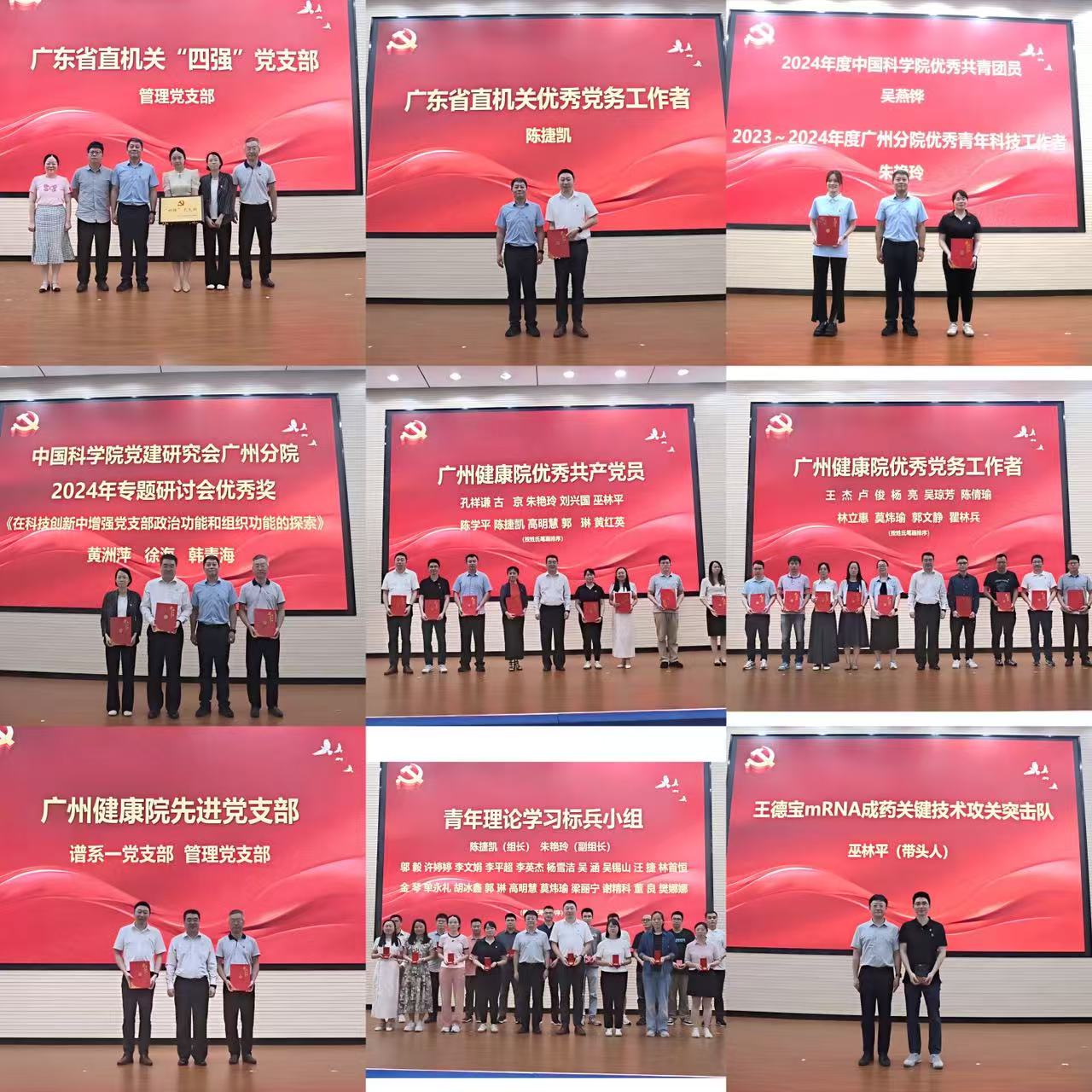 報(bào)告后,大會(huì)舉行新黨員入黨宣誓儀式,全體黨員重溫入黨誓詞。會(huì)議表彰了省直機(jī)關(guān)“四強(qiáng)”黨支部、優(yōu)秀黨務(wù)工作者、中國科學(xué)院優(yōu)秀共青團(tuán)員和廣州分院優(yōu)秀青年科技工作者、廣州健康院“兩優(yōu)一先”等先進(jìn)個(gè)人與集體,并為青年理論學(xué)習(xí)標(biāo)兵小組授章。為激勵(lì)科研尖兵勇闖“無人區(qū)”,會(huì)上為新成立的王德寶mRNA成藥關(guān)鍵技術(shù)攻關(guān)突擊隊(duì)授牌。