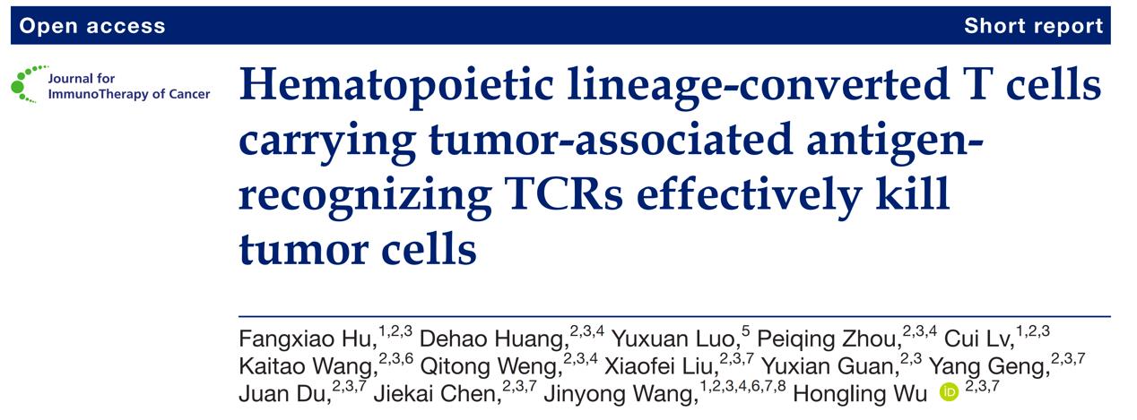 7月14日,中科院廣州生物醫(yī)藥與健康研究院王金勇課題組在腫瘤免疫治療學(xué)會(huì)(Society for Immunotherapy of Cancer)的官方期刊Journal for ImmunoTherapy of Cancer (JITC) 在線發(fā)表了題為Hematopoietic lineage-converted T cells carrying tumor-associated antigen-recognizing TCRs effectively kill tumor cells的論文?;谇捌诎l(fā)現(xiàn)的轉(zhuǎn)分化方法再生T細(xì)胞技術(shù)(Nature Immunology, 2018),該研究進(jìn)一步嘗試結(jié)合TCR-T(識別自身MHC限制性的細(xì)胞內(nèi)抗原)抗腫瘤原理,通過含有Hoxb5轉(zhuǎn)錄因子與TCR序列串聯(lián)表達(dá)元件的病毒轉(zhuǎn)導(dǎo)系統(tǒng)遞送,誘導(dǎo)pro-pre-B祖細(xì)胞體內(nèi)快速轉(zhuǎn)分化為腫瘤特異性的TCR-T細(xì)胞,在動(dòng)物腫瘤模型上首次證明該新來源TCR-T具備抗腫瘤活性。