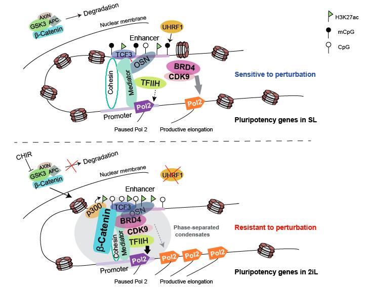 近日,中國科學(xué)院廣州生物醫(yī)藥與健康研究院Miguel A. Esteban實(shí)驗(yàn)室和以色列魏茨曼科學(xué)研究院Jacob H. Hanna實(shí)驗(yàn)室及武漢大學(xué)陳亮實(shí)驗(yàn)室的研究人員合作在Science Advances在線發(fā)表了文章‘β-Catenin safeguards the ground state of mouse pluripotency by strengthening the robustness of the transcriptional apparatus’。該研究發(fā)現(xiàn)在基態(tài)多能干細(xì)胞中,激活的β-catenin通過在多能性位點(diǎn)招募輔調(diào)控因子促進(jìn)多能性基因的轉(zhuǎn)錄起始,減少了對BRD4/CDK9調(diào)控的暫停釋放的依賴,但是對抑制轉(zhuǎn)錄起始更敏感,從而解釋了基態(tài)多能干細(xì)胞在面臨外界擾動時(shí)更穩(wěn)定的原因。但與此同時(shí),胚胎多能干細(xì)胞的細(xì)胞周期相關(guān)的基因仍然高度依賴暫停釋放機(jī)制進(jìn)行轉(zhuǎn)錄,因此兩種條件下的胚胎多能干細(xì)胞的增殖均對抑制BRD4/CDK9敏感。