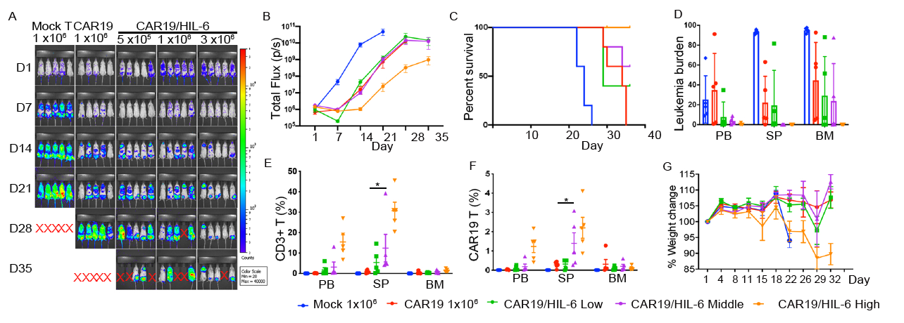 在本研究中,首先設(shè)計(jì)和構(gòu)建了一種持續(xù)表達(dá)且激活IL-6跨信號的CAR-T細(xì)胞。在體外和異種移植腫瘤模型中,HIL-6 CAR-T細(xì)胞的增殖和抗腫瘤效果得到明顯增強(qiáng),轉(zhuǎn)錄組分析結(jié)果表明CAR-T細(xì)胞在HIL-6的刺激作用下,上調(diào)了與T細(xì)胞遷移、早期記憶分化以及IL-6/GP130/STAT3相關(guān)的信號基因。動物模型進(jìn)一步發(fā)現(xiàn),HIL-6 CAR-T細(xì)胞會引起嚴(yán)重的移植物抗宿主?。?/span>GVHD)及CRS,從而限制HIL-6 CAR-T 細(xì)胞的臨床應(yīng)用。由于IL-6跨信號主要通過激活GP130信號通路,我們設(shè)計(jì)了一種能持續(xù)激活GP130的CAR-T細(xì)胞,結(jié)果顯示,在B細(xì)胞白血病和實(shí)體腫瘤的臨床前模型中,GP130 CAR-T細(xì)胞的增殖和抗腫瘤效果仍然明顯,且不會出現(xiàn)嚴(yán)重GVHD和CRS反應(yīng)。以上結(jié)果表明了IL-6跨信號能顯著提升CAR-T抗腫瘤作用,而GP130 CAR-T 的臨床應(yīng)用更安全。 同時(shí)提示在CAR T 細(xì)胞治療過程出現(xiàn)CRS時(shí),不應(yīng)過早使用抗IL-6R的中和抗體。
