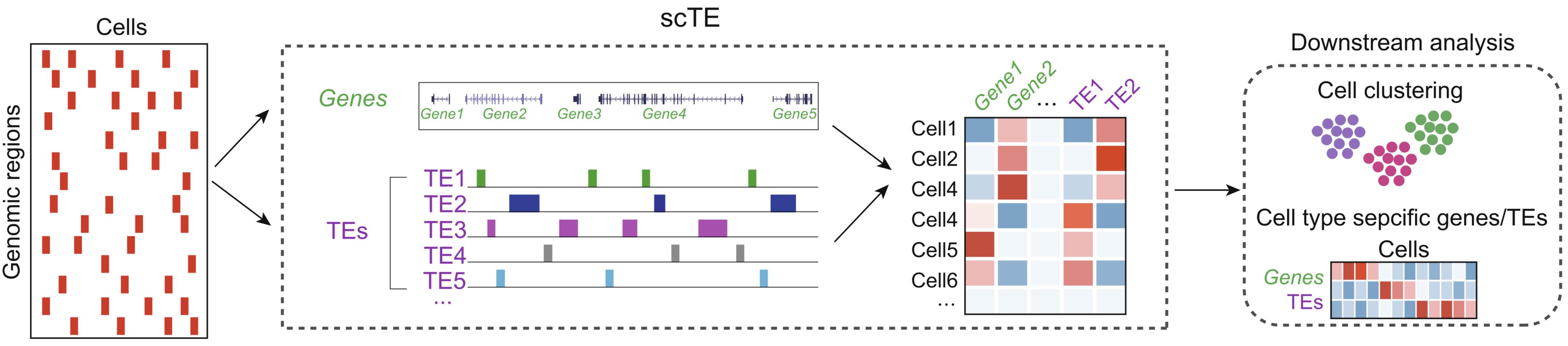 轉(zhuǎn)座元件(TEs)是人類基因組中含量最多的遺傳信息,是指一類能夠在基因組內(nèi)移動(dòng)的DNA序列。TEs的插入和跳躍可以改變基因組遺傳信息,是物種進(jìn)化的重要原動(dòng)力。盡管大部分TEs已經(jīng)喪失了“跳躍”的能力,成為了基因組中的“分子化石”。但近年來(lái)研究發(fā)現(xiàn),TEs可以通過(guò)影響染色質(zhì)表觀遺傳修飾、轉(zhuǎn)錄因子結(jié)合、RNA編輯以及染色質(zhì)構(gòu)象等,對(duì)基因表達(dá)起著非常重要的調(diào)控作用。單細(xì)胞轉(zhuǎn)錄組測(cè)序(scRNA-seq)是研究細(xì)胞命運(yùn)狀態(tài)的絕佳技術(shù),近年來(lái),更多的單細(xì)胞測(cè)序技術(shù)以及相應(yīng)的生物信息學(xué)分析方法也在不斷改進(jìn),總體的目標(biāo)是擴(kuò)展能捕獲的信息及挖掘能代表生物學(xué)功能的潛在維度。然而,目前從scRNA-seq數(shù)據(jù)分析的工具包都只定量基因的表達(dá),分析TEs的表達(dá)還比較困難,缺乏相關(guān)研究需要的生物信息學(xué)分析的工具包,因而忽略了基因組中含量最多的TEs來(lái)源的遺傳信息。