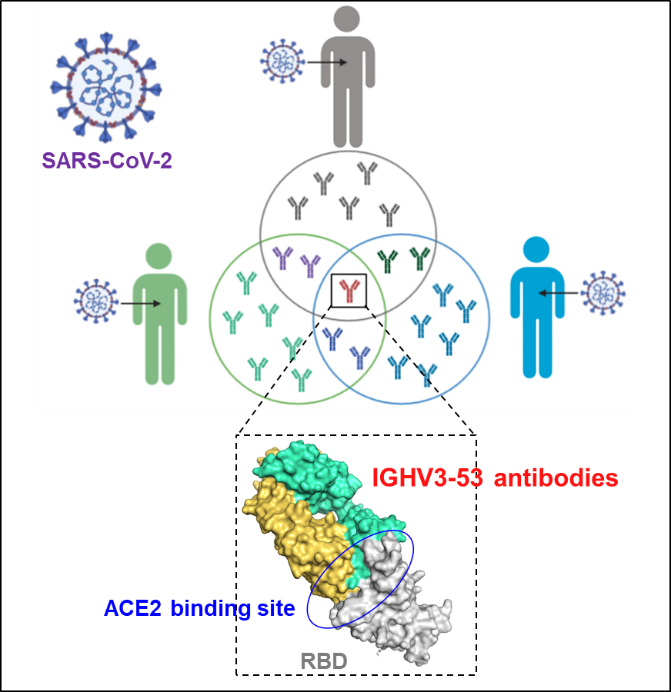 新冠病毒感染后,IGHV3-53編碼的共享抗體能快速產(chǎn)生并特異性識(shí)別新冠病毒S蛋白RBD區(qū)域的ACE2受體結(jié)合位點(diǎn)