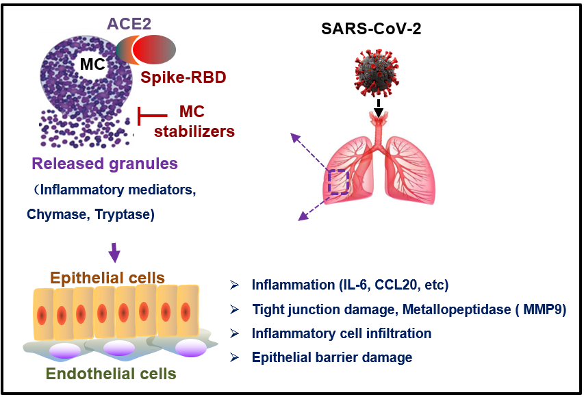 SARS-CoV-2 Spike蛋白通過結(jié)合肥大細胞ACE2受體快速誘導肥大細胞脫顆粒,繼而誘發(fā)肺上皮細胞炎癥和導致肺損傷;臨床治療變應性疾病的藥物如依巴斯汀和氯雷他定可作為肥大細胞穩(wěn)定劑通過阻止Spike蛋白誘導的肥大細胞脫顆粒,進而抑制SARS-CoV-2誘導的小鼠肺部炎癥和保護肺損傷。