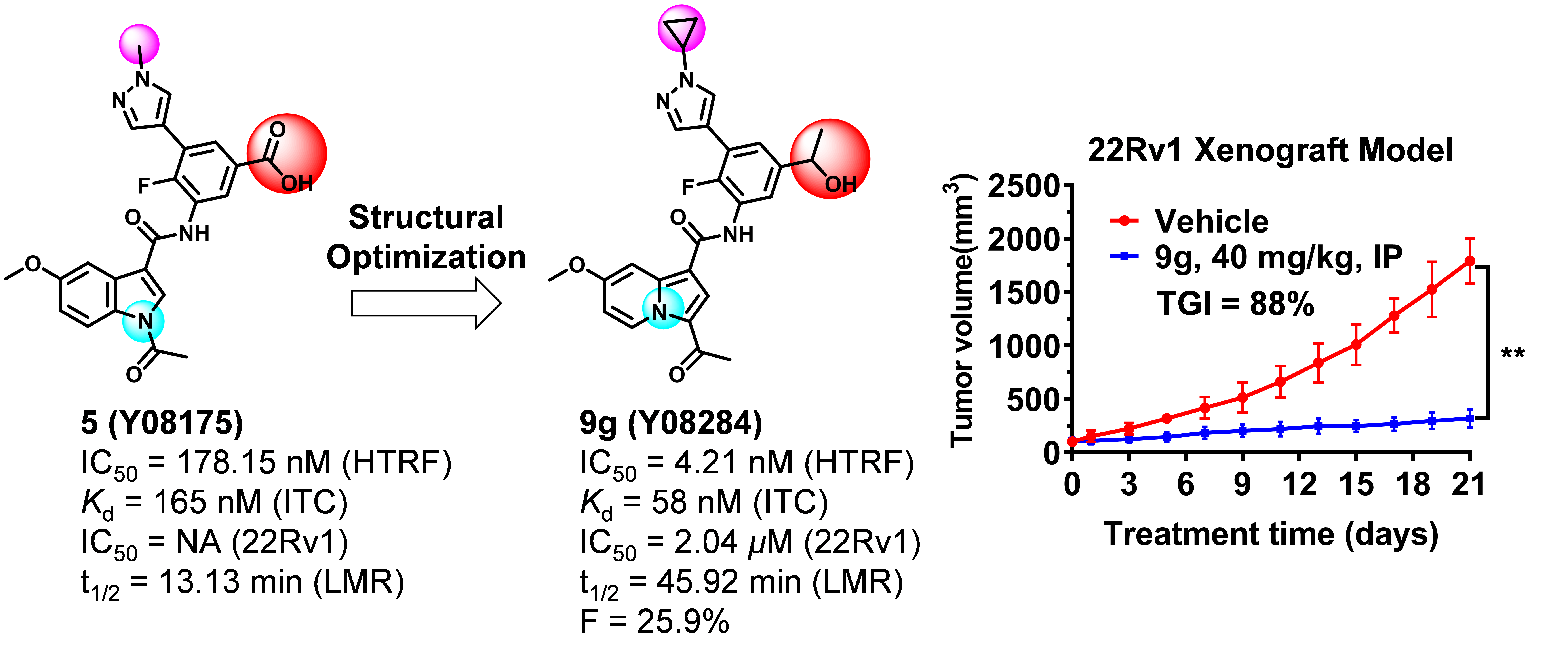 前列腺癌是一種雄激素依賴性的惡性腫瘤,極大地威脅著男性的健康。現(xiàn)有的治療前列腺癌藥物均很快出現(xiàn)耐藥問(wèn)題。因此,臨床上急需開(kāi)展基于新靶點(diǎn)、新機(jī)制的抗前列腺癌藥物研究。為了解決上述問(wèn)題,中國(guó)科學(xué)院廣州生物醫(yī)藥與健康研究院許永課題組針對(duì)前列腺癌治療新靶標(biāo)CBP設(shè)計(jì)合成了新型小分子抑制劑,代表性分子Y08284經(jīng)過(guò)動(dòng)物實(shí)驗(yàn)證明有望治療耐藥性前列腺癌。該成果于近日以Design, Synthesis, and Biological Evaluation of 1?(Indolizin-3-yl)ethan-1-ones as CBP Bromodomain Inhibitors for the Treatment of Prostate Cancer為題發(fā)表在Journal of Medicinal Chemistry的Epigenetics專刊上。