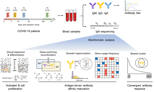基于抗體組學(xué)技術(shù)、從抗體庫(kù)轉(zhuǎn)錄水平分析新冠感染引起的B細(xì)胞反應(yīng)在克隆增殖與分化、抗體類別轉(zhuǎn)換、體細(xì)胞高頻突變、抗體基因使用頻率及共享抗體克隆型等方面的動(dòng)態(tài)變化與關(guān)鍵特征。
