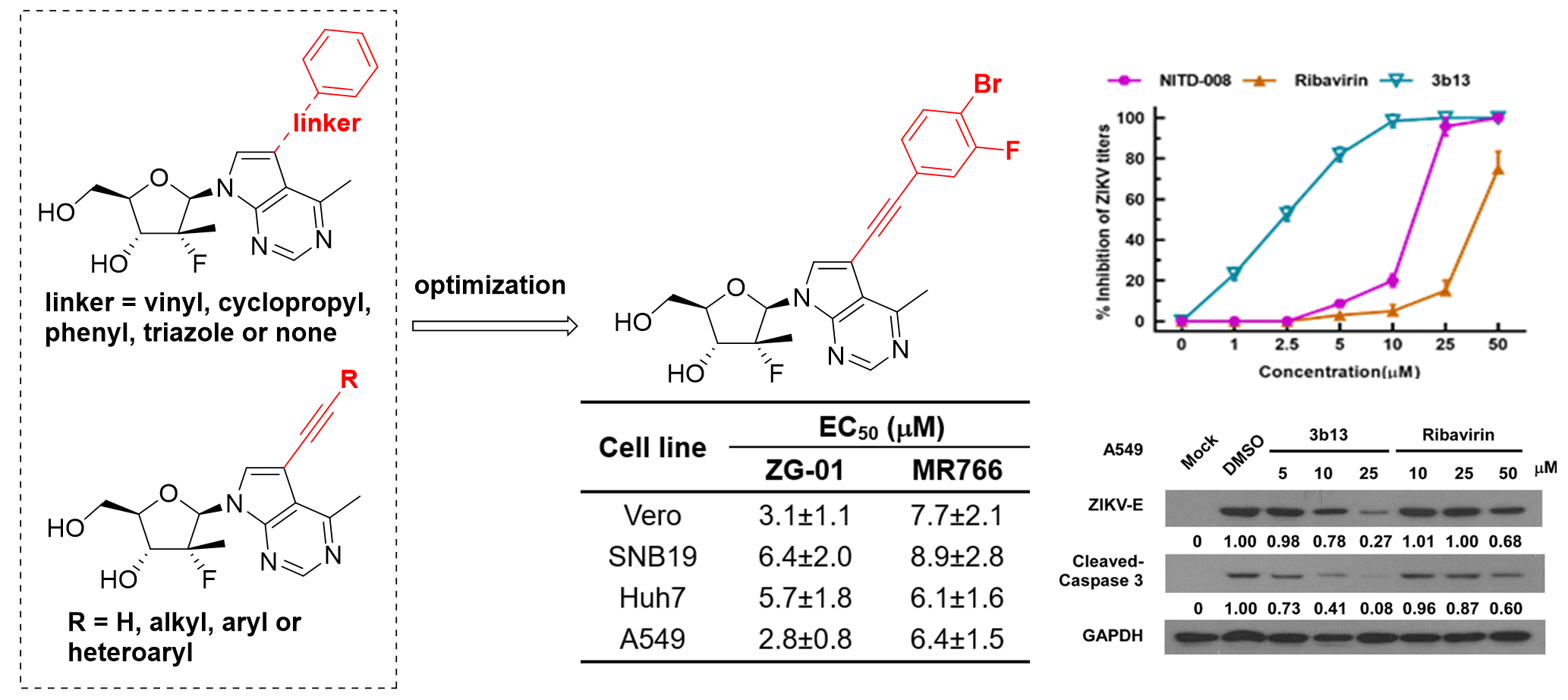 該研究設(shè)計(jì)、合成并評(píng)估了一系列新型 6-甲基-7-乙炔基-7-脫氮嘌呤核苷類似物針對(duì)ZIKV的抑制活性和構(gòu)效關(guān)系 (SAR)。其中核苷類似物3b13在基于 A549 的細(xì)胞模型中顯示出最有效的抗ZIKV活性(EC50 = 2.8 ± 0.8 μM,EC90 = 6.8 ± 2.3 μM),比陽(yáng)性對(duì)照NITD008強(qiáng)約5倍,且細(xì)胞毒性較低(CC50 = 54.1 ± 6.9 μM)。并且3b13在包括 SNB19、A549、Huh7、Vero 在內(nèi)的多種類型的宿主細(xì)胞中對(duì)不同的ZIKV毒株(ZG-01 和 MR766)均顯示出相似的抑制效力。此外,3b13對(duì)寨卡病毒RdRp蛋白的親和力(Kd = 1.87 μM)高于NITD008(Kd = 3.43 μM)。這些結(jié)果表明,3b13是一個(gè)有開(kāi)發(fā)前景的抗ZIKV候選藥物。