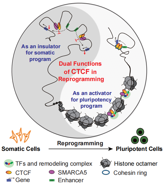 研究人員發(fā)現(xiàn)CTCF在體細(xì)胞重編程過(guò)程中表達(dá)逐漸升高,并發(fā)揮促進(jìn)體細(xì)胞重編程為誘導(dǎo)多能干細(xì)胞的作用。在此過(guò)程中,CTCF具有同時(shí)抑制體細(xì)胞相關(guān)基因表達(dá)和促進(jìn)多能性基因網(wǎng)絡(luò)激活的雙重功能。機(jī)制分析發(fā)現(xiàn)CTCF不僅通過(guò)發(fā)揮染色質(zhì)絕緣功能抑制體細(xì)胞相關(guān)基因的表達(dá),而且發(fā)現(xiàn)CTCF具有維持多能性基因染色質(zhì)開(kāi)放的作用,CTCF還結(jié)合在部分多能性基因啟動(dòng)子區(qū),促進(jìn)這些多能性基因增強(qiáng)子(Enhancer)和啟動(dòng)子(Promoter)之間的相互作用(EP互作)。此外,該研究還揭示CTCF與染色質(zhì)重塑因子SMARCA5形成蛋白復(fù)合物,有助于維持多能性基因的染色質(zhì)開(kāi)放和多能性轉(zhuǎn)錄因子的結(jié)合,促進(jìn)多能性基因網(wǎng)絡(luò)的激活。
