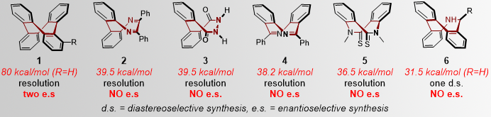 分子的手性主要有中心手性,軸手性,平面手性和螺旋手性這四種(圖1)。目前絕大部分的手性分子,不管是天然的還是人工合成的,都可以用以上四種手性類型歸屬它們的手性特征。然而,科學(xué)家們在研究大分子和超分子過程中發(fā)現(xiàn),有些分子盡管局部不含有以上的手性因素,但分子整體卻表現(xiàn)出手性。德國化學(xué)家B?hmer在深入研究杯[4]芳烴的手性現(xiàn)象后,于1994年提出了固有手性的概念(J. Inclusion Phenom. Mol. Recognit. Chem. 1994, 19, 17-39)。固有手性通常是指中環(huán)或者大環(huán)分子,由于其環(huán)狀結(jié)構(gòu)大大限定了分子的自由度,當分子的穩(wěn)定構(gòu)象與其鏡像結(jié)構(gòu)之間不能自由互變(互變能壘ΔG > 30 kcal/mol)且不能重疊而表現(xiàn)出來的手性。盡管分子的局部不含有傳統(tǒng)的四種手性因素,固有手性是分子整體的固有的特性,這一特點和螺旋手性類似。雖然中環(huán)分子也常常是有機化學(xué)家們的研究對象,但是它們偶爾表現(xiàn)出來的固有手性現(xiàn)象卻常常被忽視。其中,手性的四鄰亞苯類化合物是個例外(圖2,1)。這類化合物具有獨特的穩(wěn)定的馬鞍型結(jié)構(gòu),它被廣泛應(yīng)用于超分子、材料,以及不對稱催化領(lǐng)域。香港中文大學(xué)的黃乃正院士團隊對其進行了深入的研究(Natl. Sci. Rev. 2017, 4, 892-916)。但是,目前獲得光學(xué)純的手性四鄰亞苯類化合物往往是通過拆分的方法獲得,拆分效率較低、操作繁瑣。對于具有類似的穩(wěn)定馬鞍型構(gòu)象的氮雜八員環(huán)類似物(圖2,2-6),它們的穩(wěn)定構(gòu)象與其鏡像結(jié)構(gòu)之間的互變能壘雖然比四鄰亞苯1低很多,但也普遍在30-40 kcal/mol之間,是比較穩(wěn)定的手性化合物。對它們的不對稱合成以及它們的衍生物作為手性配體或者催化劑的應(yīng)用研究,在國內(nèi)外還是空白。對這類八員環(huán)的手性屬性問題,也沒有得到廣泛的共識。