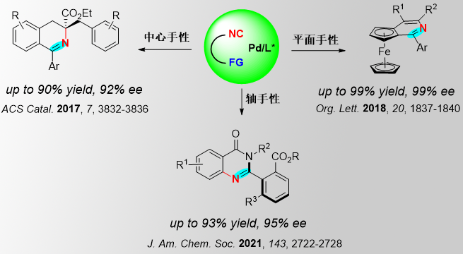 異腈基團作為一類結(jié)構(gòu)特殊的官能團,被廣泛應(yīng)用于含氮雜環(huán)的合成中。其中,朱強團隊在鈀催化的官能化異腈的不對稱轉(zhuǎn)化研究中,取得了一系列創(chuàng)新性成果,成功的應(yīng)用于含中心手性,平面手性和軸手性的含氮雜環(huán)構(gòu)建中(圖3)。