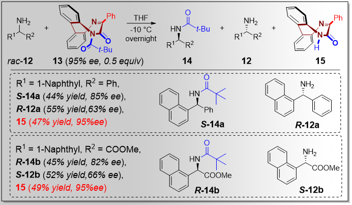 這些結(jié)構(gòu)新穎且獨特的固有手性氮雜八元環(huán)試劑、催化劑和配體在多種不對稱轉(zhuǎn)化中,大多都表現(xiàn)出優(yōu)異的結(jié)果。例如,化合物13作為手性轉(zhuǎn)?;噭?,對外消旋伯胺類化合物以及氨基酸酯進行有效地拆分(圖7)。脫除酰基后的固有手性氮雜八元環(huán)母核15可以幾乎定量回收,且ee值保持,因此可以重復(fù)使用。