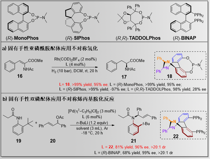其次,在Rh催化烯酰胺的不對稱氫化中測試了DDDOL衍生的亞磷酰胺配體18,初步結(jié)果表明,其具有同經(jīng)典亞磷酰胺配體相同或相近的結(jié)果(圖8,a)。此外,將DDDOL衍生的雙膦配體22應(yīng)用于Pd催化的烯丙基胺化反應(yīng)中,以優(yōu)異的對映選擇性首次實現(xiàn)了在此類反應(yīng)中同時引入中心手性和C-N軸手性(圖8,b)。并且,與經(jīng)典的BINAP配體比較,在他們發(fā)展的固有手性配體下,產(chǎn)率更優(yōu)異。這些手性配體和催化劑在多個不對稱反應(yīng)展現(xiàn)出的優(yōu)異結(jié)果,可以和現(xiàn)有的優(yōu)勢骨架配體形成互補,為眾多的不對稱反應(yīng)提供候選配體和催化劑。以上的研究勢必會引起國內(nèi)外學(xué)者對中環(huán)化合物固有手性問題的重視。