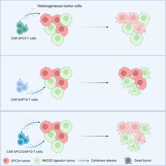 首先,研究團(tuán)隊(duì)設(shè)計(jì)了一種串聯(lián)DAP10的嵌合分子,實(shí)驗(yàn)表明該嵌合分子可利用T細(xì)胞上的天然NKG2D受體靶向表達(dá)NKG2D配體的腫瘤細(xì)胞;之后將其與抗GPC3單鏈可變片段(scFv)串聯(lián),構(gòu)建雙靶點(diǎn)嵌合抗原體系,發(fā)現(xiàn)表達(dá)串聯(lián)GPC3-DAP10嵌合受體的T細(xì)胞表現(xiàn)出雙抗原靶向作用,在體內(nèi)外可明顯抑制異質(zhì)性腫瘤細(xì)胞生長。