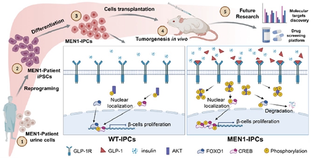 中國科學院廣州生物醫(yī)藥與健康研究院李尹雄研究員課題組等通過收集多發(fā)性內分泌瘤I型(MEN1)病人尿液細胞重編程為誘導性多能干細胞(iPSCs),結合體外胰島β樣細胞分化和免疫缺陷小鼠移植實驗,成功地再現(xiàn)了MEN1高胰島素分泌這一的關鍵表型及其背后的機制,建立了MEN1的疾病模型,并發(fā)現(xiàn)GLP-1R通路是治療由胰島素瘤導致的高胰島素血癥的潛在靶點。相關工作近日在Cells科學期刊上以Modeling MEN1 with Patient-Origin iPSCs Reveals GLP-1R Mediated Hypersecretion of Insulin為題發(fā)表。