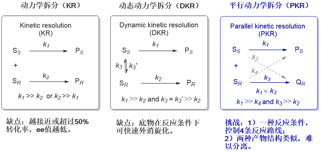 獲得手性化合物的單一對(duì)映異構(gòu)體最常見(jiàn)的途徑是對(duì)非手性底物的不對(duì)稱(chēng)催化轉(zhuǎn)化,對(duì)映選擇性地產(chǎn)生手性因素。另一種主要途徑是把已經(jīng)含有手性因素的外消旋體混合物轉(zhuǎn)化為單一的對(duì)映異構(gòu)體產(chǎn)物。這一途徑可以通過(guò)以下三種策略實(shí)現(xiàn):動(dòng)力學(xué)拆分(KR);動(dòng)態(tài)動(dòng)力學(xué)拆分(DKR);和平行動(dòng)力學(xué)拆分(PKR)。KR是利用兩種對(duì)映異構(gòu)體底物在同一個(gè)不對(duì)稱(chēng)催化條件下轉(zhuǎn)化為產(chǎn)物的速率不同(k1 >> k2 或 k2 >> k1),最理想的情況是50%的一種構(gòu)型的底物完全轉(zhuǎn)化為單一構(gòu)型的產(chǎn)物,而50%的另一種構(gòu)型的底物完全不反應(yīng)且能被回收。事實(shí)上隨著反應(yīng)的進(jìn)行,“劣勢(shì)”構(gòu)型反應(yīng)底物的相對(duì)濃度不斷增加,它也會(huì)參與反應(yīng),導(dǎo)致“有害”構(gòu)型的產(chǎn)物生成,從而降低產(chǎn)物的對(duì)映選擇性。而DKR策略有效克服了KR的缺點(diǎn),即不斷富集的“劣勢(shì)”構(gòu)型反應(yīng)底物可以不斷地發(fā)生消旋化,部分轉(zhuǎn)化為“優(yōu)勢(shì)”底物,進(jìn)而不斷地生成目標(biāo)構(gòu)型的產(chǎn)物。理想情況下,外消旋體底物可以通過(guò)DKR可以100%轉(zhuǎn)化為單一構(gòu)型的產(chǎn)物,但是前提是兩種構(gòu)型的底物在反應(yīng)條件下可以快速互變(k1 >> k2 且 k3 >> k2)。為了克服KR和DKR的固有限制, Vedejs和Chen于1997年引入了另一種叫做平行動(dòng)力學(xué)拆分(PKR)的策略,即兩種對(duì)映體底物分別沿兩條不同的反應(yīng)路徑,以相同或接近的速率轉(zhuǎn)化 (k1≈k3且k1 >> k4 且 k3>> k2),得到單一對(duì)映異構(gòu)體的兩種產(chǎn)物。在一種不對(duì)稱(chēng)反應(yīng)條件下,既要實(shí)現(xiàn)化學(xué)選擇性又要實(shí)現(xiàn)對(duì)映選擇性調(diào)控,即兩種底物兩種產(chǎn)物四條反應(yīng)路線的調(diào)控是一個(gè)巨大的挑戰(zhàn)。PKR策略的另一個(gè)挑戰(zhàn)是,所得到的兩種產(chǎn)物一般結(jié)構(gòu)類(lèi)似,從而造成產(chǎn)物分離非常困難,因此實(shí)用性好的PKR反應(yīng)并不多見(jiàn)(圖1)。