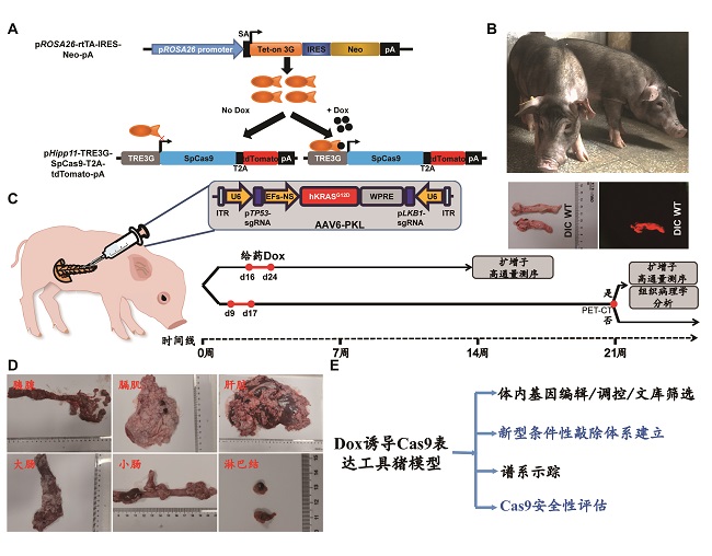 (A)Dox誘導(dǎo)Cas9蛋白表達(dá)原理圖;(B)原代Dox誘導(dǎo)Cas9表達(dá)工具豬照片;(C)基于Dox誘導(dǎo)Cas9表達(dá)工具豬構(gòu)建原發(fā)性胰腺導(dǎo)管腺癌模型示意圖;(D)原發(fā)性胰腺導(dǎo)管腺癌及其轉(zhuǎn)移器官/組織照片;(E)Dox誘導(dǎo)Cas9表達(dá)工具豬的應(yīng)用領(lǐng)域