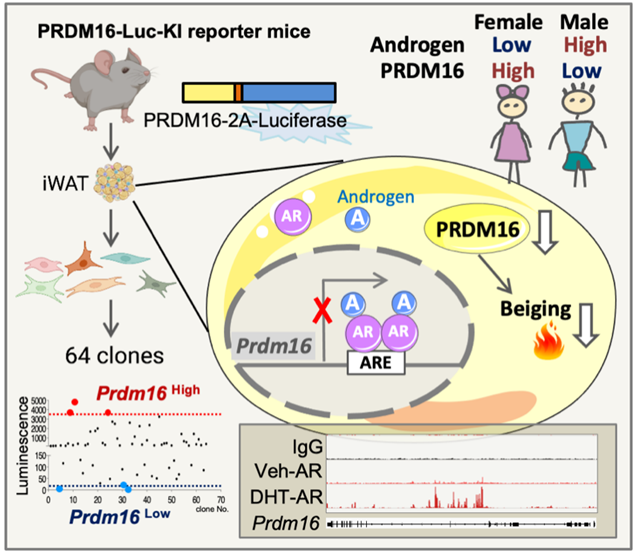 PRDM16是白色脂肪細(xì)胞褐色化的關(guān)鍵轉(zhuǎn)錄因子。在本課題中,課題組研究人員通過PRDM16報告小鼠模型和單克隆篩選技術(shù),系統(tǒng)性的分析了細(xì)胞全轉(zhuǎn)錄因子譜(1600個)與PRDM16的表達(dá)水平相關(guān)性,發(fā)現(xiàn)雄激素受體(AR)與PRDM16呈現(xiàn)最強的負(fù)相關(guān)性。細(xì)胞及動物水平實驗進(jìn)一步證實雄激素受體直接結(jié)合Prdm16基因位點,抑制其轉(zhuǎn)錄表達(dá),脂肪細(xì)胞特異性敲除雄激素受體小鼠的米色脂肪細(xì)胞活性增強;而脂肪細(xì)胞高表達(dá)雄激素受體的小鼠則表現(xiàn)出米色化減弱。此外,值得一提的是,本研究同時發(fā)現(xiàn)人體脂肪組織中PRDM16 的表達(dá)存在性別差異——相比男性個體,女性具有更高的PRDM16表達(dá)水平,從臨床上證實了雄激素及其受體通路對PRDM16和米色脂肪的抑制作用。該工作從多方面證實了雄激素受體在米色脂肪細(xì)胞的負(fù)調(diào)控作用,為理解脂肪組織的性別差異提供了新的觀點。