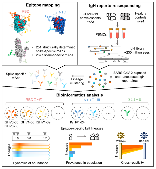 靶向新冠病毒(SARS-CoV-2)刺突蛋白(Spike)的中和抗體是保護(hù)性體液免疫的關(guān)鍵組成部分,全面剖析SARS-CoV-2感染誘導(dǎo)的中和抗體庫的組成對(duì)于疫苗設(shè)計(jì)和評(píng)價(jià)具有重要科學(xué)意義。此前該領(lǐng)域的研究主要基于傳統(tǒng)的血清學(xué)和細(xì)胞生物學(xué)方法,為疫苗的設(shè)計(jì)和改進(jìn)提供了重要理論基礎(chǔ)。而在Spike整體水平或在亞結(jié)構(gòu)域(RBD、NTD 或 S2)水平上分析特異性抗體反應(yīng),無法區(qū)分靶向特定表位的抗體組成。雖然此前有研究嘗試使用優(yōu)化的血清學(xué)方法利用線性肽來繪制SARS-CoV-2刺突蛋白不同表位抗體譜,然而這些方法僅適用于研究線性表位,無法表征靶向構(gòu)象表位的抗體。為了克服上述障礙,我們使用高通量免疫球蛋白測(cè)序(IR-seq)來分析抗體組庫,為SARS-CoV-2感染后的系統(tǒng)B細(xì)胞反應(yīng)應(yīng)答機(jī)理提供獨(dú)特的視角(http://m.srimangroup.com/xwdt/kydt/202202/t20220224_6372075.html)。在本研究中,團(tuán)隊(duì)通過將IR-seq與結(jié)構(gòu)生物學(xué)和生物信息學(xué)相結(jié)合,建立了一種分析IR-seq抗體助學(xué)分析方法。分析了靶向SARS-CoV-2刺突蛋白上特定中和表位的抗體譜系的豐度和人群共享度的 定量關(guān)系(圖1)。基于該方法,研究人員首先利用252個(gè)已解析結(jié)構(gòu)的Spike特異性人源單克隆抗體,繪制了識(shí)別Spike的中和表位譜。研究發(fā)現(xiàn)中和抗體的識(shí)別位點(diǎn)與刺突蛋白受體結(jié)合域(RBD)上的突變熱點(diǎn)之間高度重疊,提示中和抗體對(duì)RBD的強(qiáng)選擇壓力。