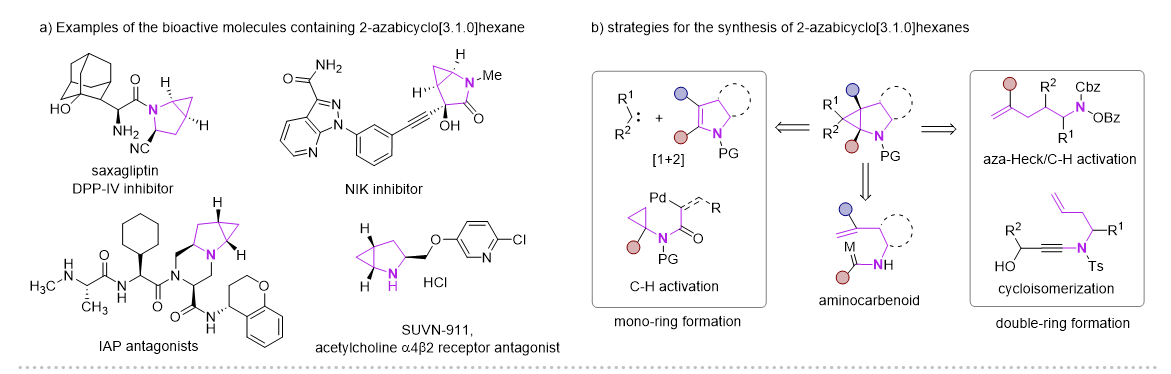 2-氮雜雙環(huán)[3.1.0]己烷骨架因其獨特的結(jié)構(gòu)優(yōu)勢,廣泛應用在藥物分子、生物活性分子以及有機合成領(lǐng)域,其中三元環(huán)的存在可以降低分子的親脂性以及調(diào)節(jié)N-中心的堿性。目前這類骨架的合成主要方法有Simmons-Smith環(huán)丙烷化、Kulinkovich環(huán)丙烷化、鈀催化分子內(nèi)碳氫活化、以及分子內(nèi)環(huán)異構(gòu)化實現(xiàn)。但這些多數(shù)都集中在其消旋體的構(gòu)建,以及N上通常需要保護。