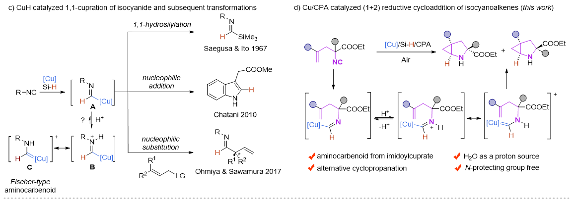 近年來,Cu-H催化的烯烴的1,2-氫官能化反應取得了飛速的發(fā)展,尤其是在對映選擇性氫胺基化領(lǐng)域,Buchwald課題組做了開創(chuàng)性且系統(tǒng)性的工作 (Acc. Chem. Res. 2020,53,1229?1243)。但與此形成鮮明對比的是,Cu-H催化的異腈的1,1-氫官能化反應模式相對單一,這主要是由于形成的甲酰亞胺銅中間體是親核性的,只能發(fā)生親核取代和親核加成反應。在此前的報道中,一些過渡金屬諸如Ni,Co,很容易與異腈配位形成亞胺金屬絡合物。在酸性條件下,這類物種更傾向于異構(gòu)形成一類新型的氨基金屬卡賓(Organometallics.,2003,22,2817?2819;Organometallics.,2021,40,968?978),但這類物種活性尚未被廣泛研究。