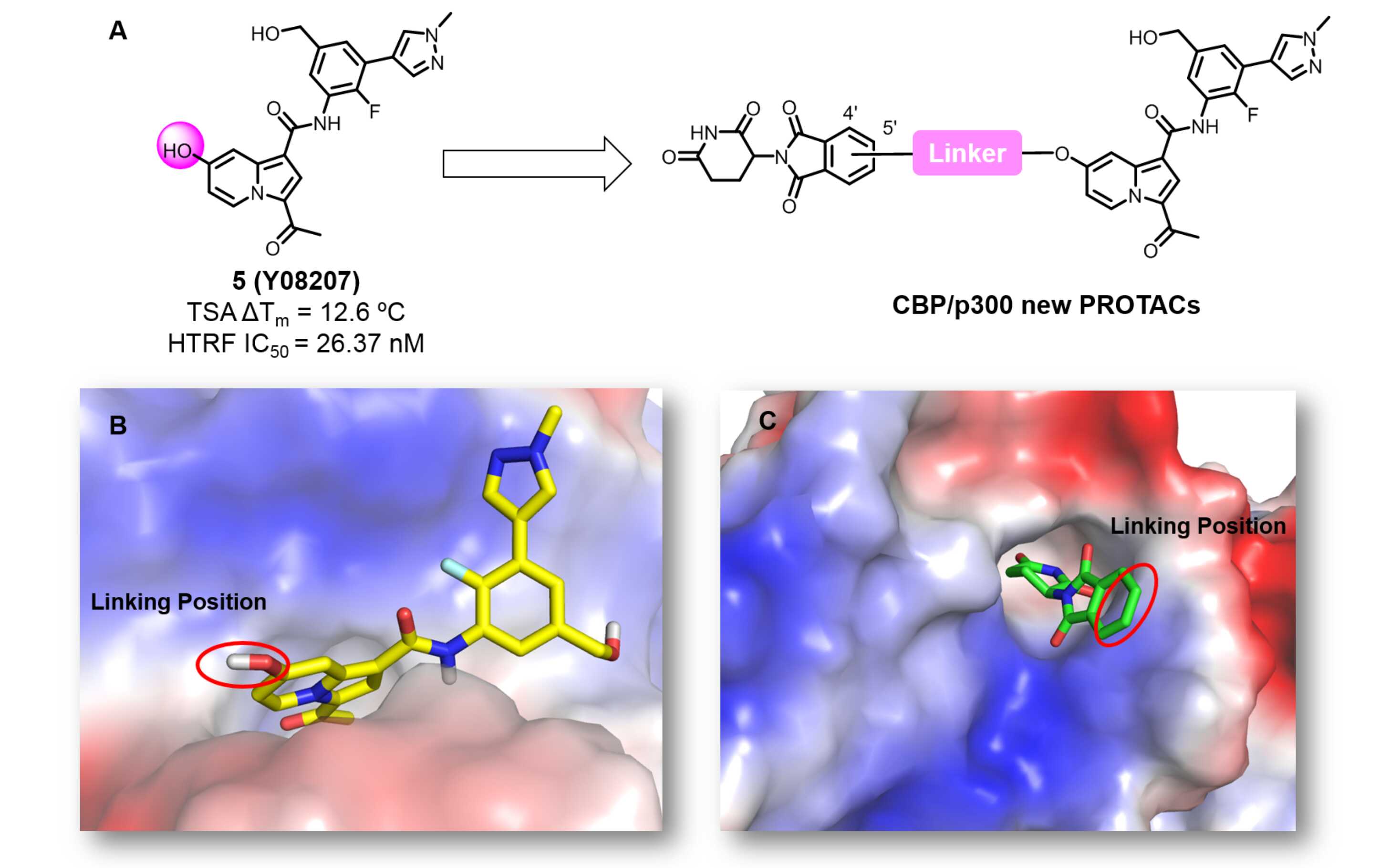 許永團(tuán)隊(duì)長(zhǎng)期致力于CBP/p300的研究,并獲得了系統(tǒng)性成果(Eur. J. Med. Chem. 2018;Acta Pharmacol. Sin. 2019;J. Med. Chem. 2022;J. Med. Chem. 2018;Bioorg. Chem. 2024)。本研究將課題組前期開發(fā)的高活性、高選擇性的CBP/p300小分子抑制劑Y08207作為靶蛋白配體,沙利度胺作為E3連接酶CRBN配體,設(shè)計(jì)并合成了一系列具有新穎結(jié)構(gòu)的CBP/p300 PROTAC分子(圖1),可用于AML的治療。