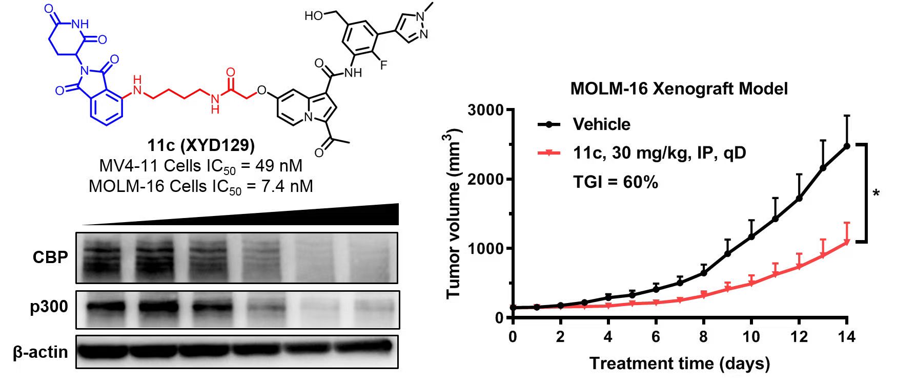 通過系統(tǒng)的構(gòu)效關(guān)系研究和生物活性評(píng)價(jià),最終發(fā)現(xiàn)高活性的CBP/p300降解劑XYD129(圖2)。該降解劑能有效結(jié)合CBP/p300和CRBN,并形成穩(wěn)定的三元復(fù)合物。XYD129可抑制AML細(xì)胞系MV4-11和MOLM-16的增殖(IC50分別為49 nM和7.4?nM),并通過蛋白酶體途徑降解CBP和p300蛋白(圖2)。在MOLM-16小鼠異種移植瘤模型中,XYD129可顯著抑制小鼠體內(nèi)腫瘤的生長(zhǎng)(TGI = 60%)(圖2)。本研究為AML的治療提供了新的候選藥物。