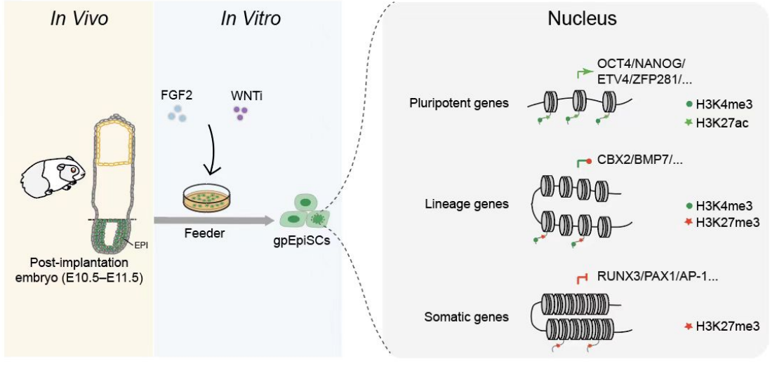 在該項研究中,研究團隊從豚鼠植入后胚胎中成功分離培養(yǎng)出始發(fā)態(tài)多能干細胞系gpEpiSCs。這些細胞系在優(yōu)化后的培養(yǎng)基中能穩(wěn)定傳代并維持多能性,表達OCT4、SOX2和NANOG等關鍵多能性標志物,能夠形成具有三個胚層細胞類型的畸胎瘤,核型穩(wěn)定。在信號調(diào)控上,F(xiàn)GF2、ACTIVIN A和WNT信號通路在維持gpEpiSCs多能性和抑制分化中起關鍵作用。對轉錄組和表觀遺傳組測序分析顯示,gpEpiSCs在與人類和嚙齒動物的始發(fā)態(tài)多能干細胞高度相似的同時也表現(xiàn)出獨特的基因表達譜,提供了新的物種特異性多能機制見解。