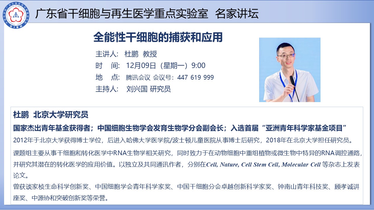 2024年12月9日廣東省干細胞與再生醫(yī)學重點實驗室名家講壇:全能性干細胞的捕獲和應用