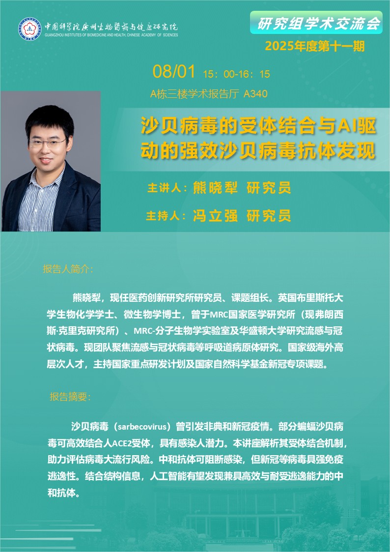 2025年8月1日研究組學術交流會(2025年度第十一期): 沙貝病毒的受體結合與AI驅動的強效沙貝病毒抗體發(fā)現(xiàn)