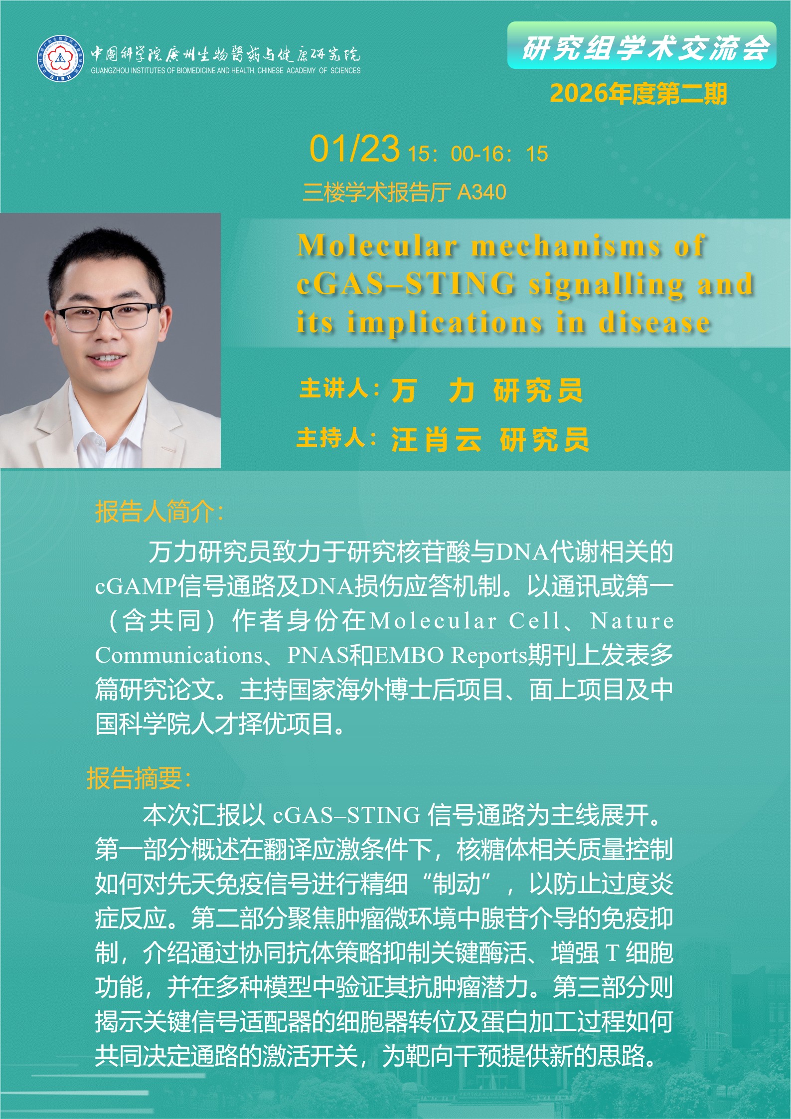 2026年1月23日研究組學(xué)術(shù)交流會(2026年度第二期):Molecular mechanisms of cGAS–STING signalling and its implications in disease