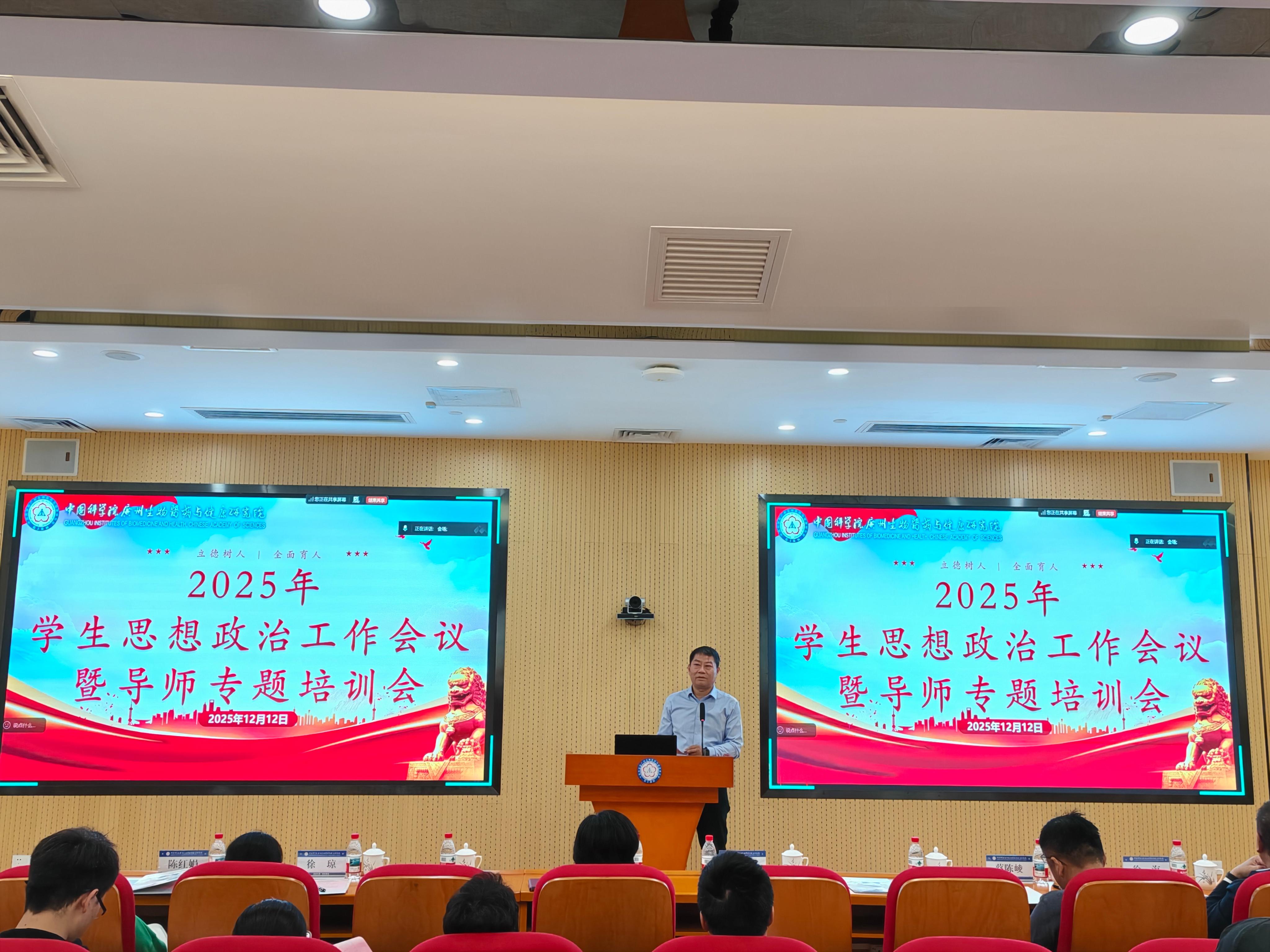 為深入學習貫徹習近平新時代中國特色社會主義思想和黨的二十大及歷次全會精神,落實《中國共產(chǎn)黨思想政治工作條例》及中國科學院關(guān)于加強學生思想政治工作相關(guān)部署,強化學生思政工作建設,12月12日,廣州健康院召開2025年學生思想政治工作會議暨研究生導師培訓會。會議聚焦新時代人才培養(yǎng)使命,系統(tǒng)總結(jié)年度思政工作,部署重點任務,凝聚培養(yǎng)“有理想、敢擔當、能吃苦、肯奮斗”的高水平科技人才共識。